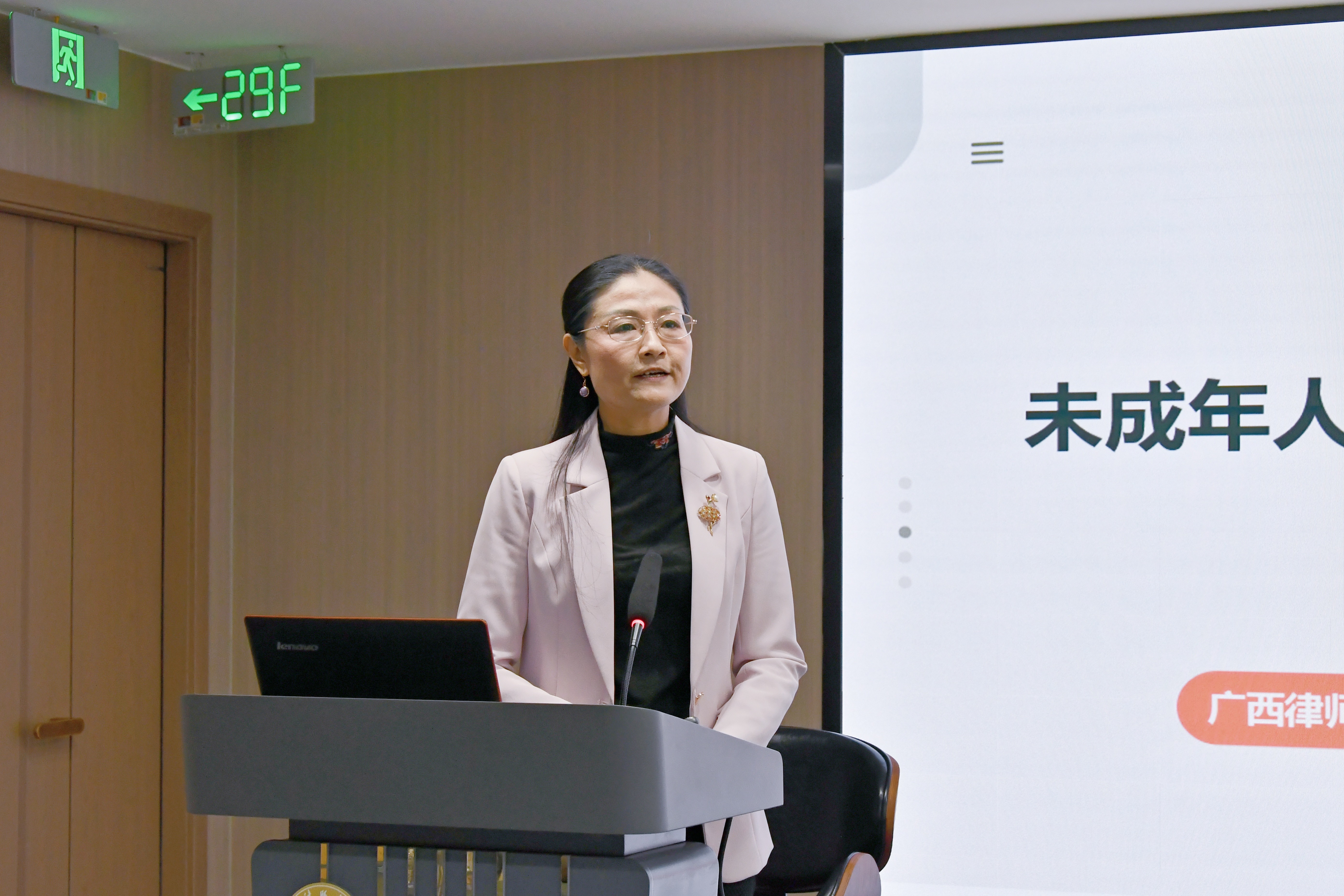 黄春芳律师以《未成年人刑事司法保护之律师路径》为主题,从“健全律协未成年人保护机构”、“律师为涉案未成年人的帮助和作用”、“强化律师服务在涉未成年人刑事案件中有效性的总体思路”、“广西未保律师的活动开展情况”四个方面进行分享,强调了健全律协未成年人保护机构的重要性,提出了附条件不起诉、社会调查报告等新思路,建议建立涉未成年人案件法律援助律师库、法律援助时间前移,倡议支持刑事附带民事诉讼未成年人被害人精神抚慰金的主张等等,深入剖析了未成年人保护案件中的核心法律问题与代理要点,为与会者提供了极具针对性的业务指引。最后,她还介绍了广西未保律师的活动开展情况,展示了当地律师在未成年人保护领域的积极实践与成果。