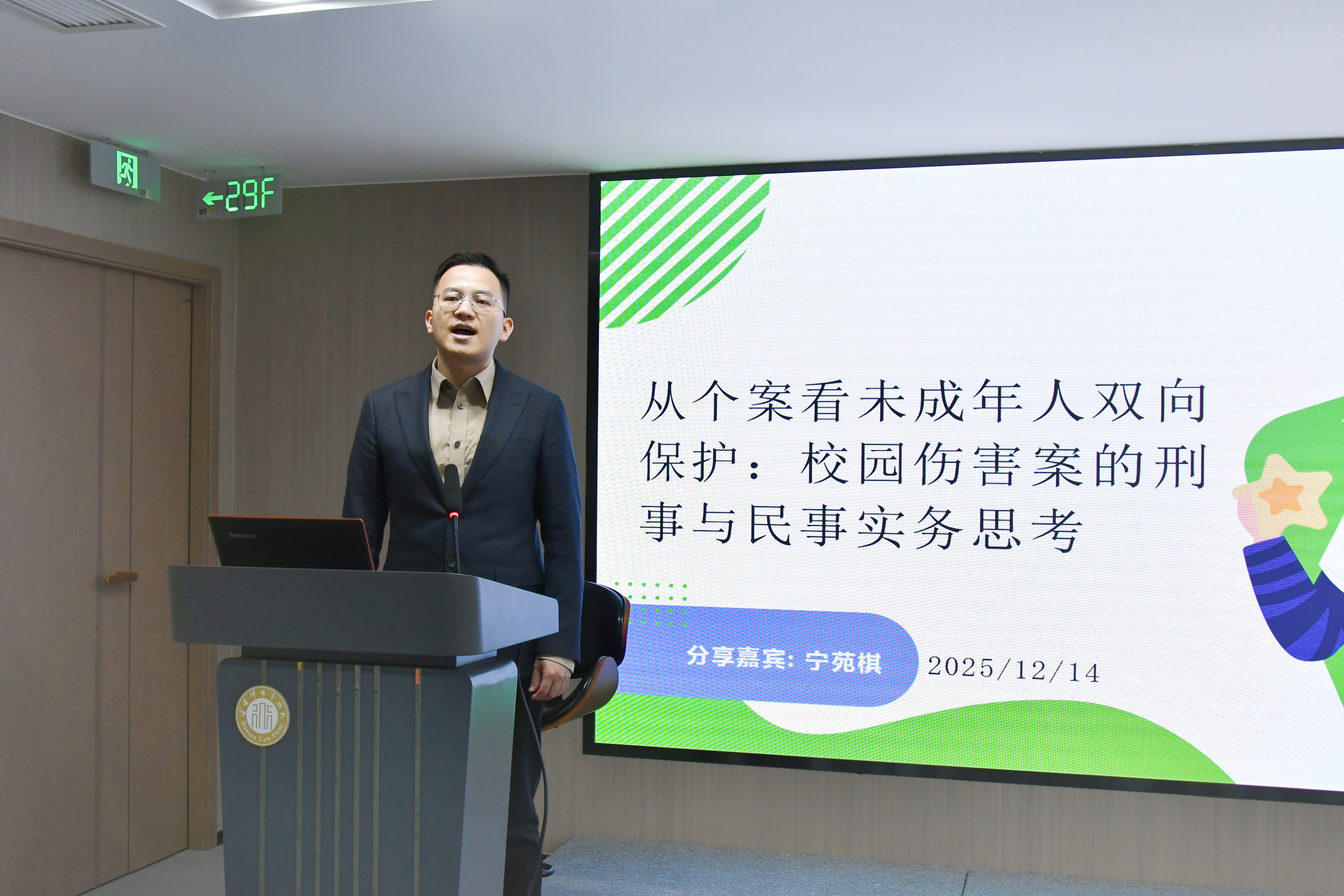 宁苑棋律师作了《从个案看未成年人双向保护:校园伤害案的刑事与民事实务思考》的主题分享。他结合自己亲办的校园伤害案件,从刑事和民事两个维度深入剖析了未成年人双向保护的重要性。在刑事方面,详细阐述了校园伤害案件中犯罪构成要件的认定、量刑情节的考量以及辩护策略的选择;在民事方面,着重分析了侵权责任主体、赔偿范围和赔偿标准的确定等问题。宁律师强调,在处理校园伤害案件时,要兼顾未成年犯罪嫌疑人和未成年被害人的合法权益,实现双向保护,既要帮助未成年犯罪嫌疑人改过自新、回归社会,又要保障未成年被害人的损失得到合理赔偿、心理得到及时抚慰。通过实际案例的分享,为与会律师处理类似案件提供了宝贵的经验和思路。