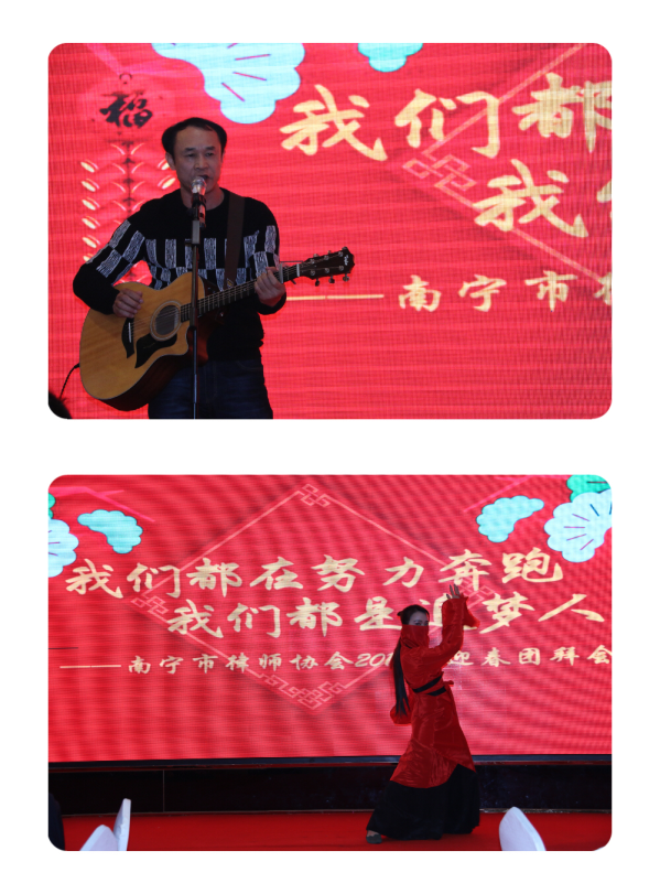 广西君桂律师事务所选送的汉舞《礼仪之邦》,诉说着华夏源远流长的五千年文化;广西桂三力律师事务所黄永坚律师深情弹唱《月半小夜曲》,听得让人无比陶醉。