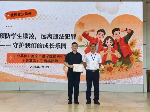 9月22日,宁苑棋律师又走进南宁市邕宁区第四小学,面向近200名学生开展同主题的法治教育讲座。通过情景模拟、实例分析等丰富形式,他帮助学生识别校园欺凌行为,掌握防范与应对方法,有效提升了学生的法律意识和安全自护能力。