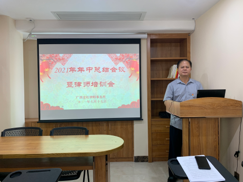 2021年7月17日上午,广西宏松律师事务所召开2021年年中总结会暨律师业务培训会。会上对本所今年上半年各项工作进行了总结,明确了下半年工作重心,并进行了律师业务培训。本所全体律师、行政人员参加了本次会议。会议由张宏新主任主持。