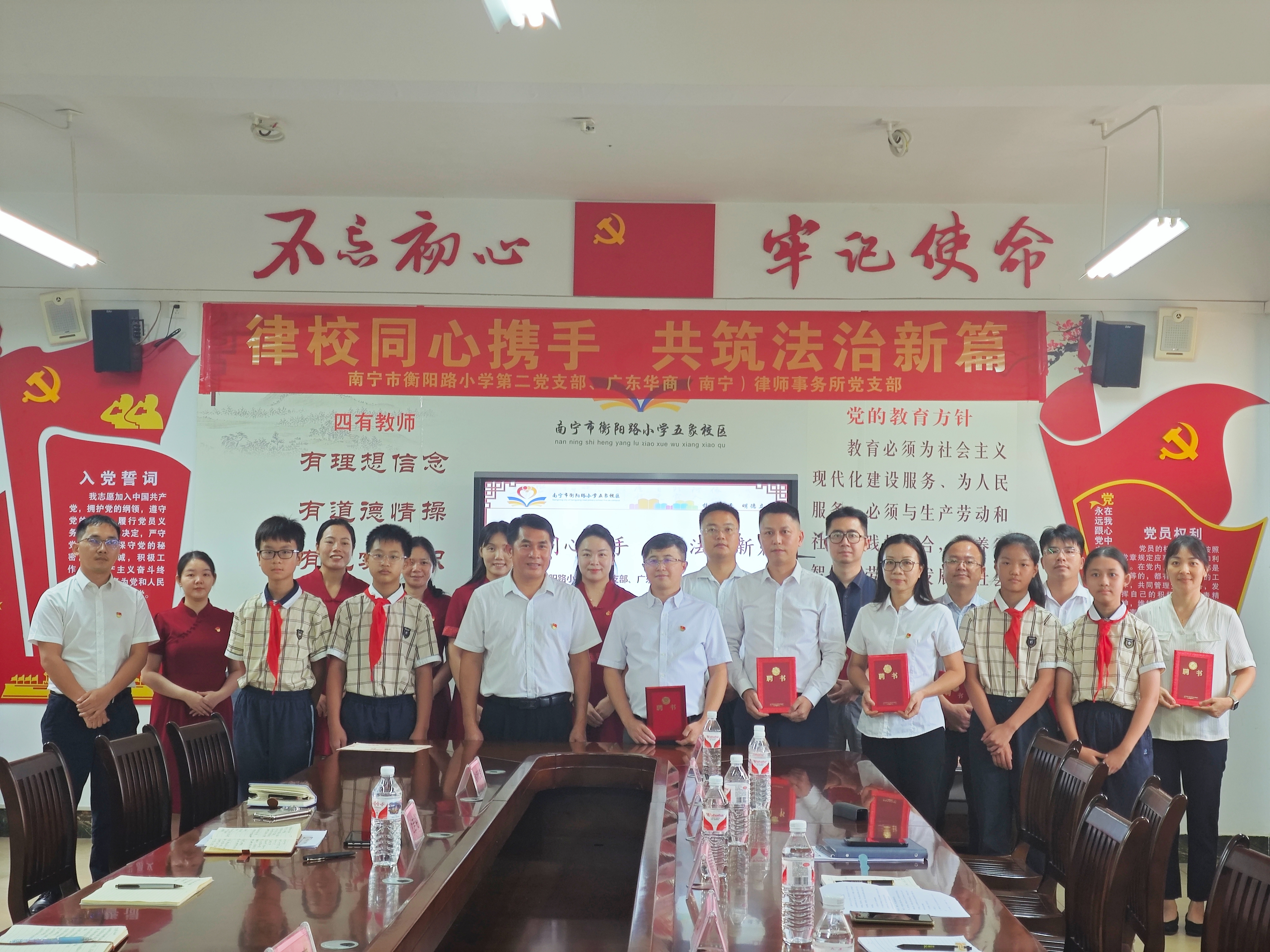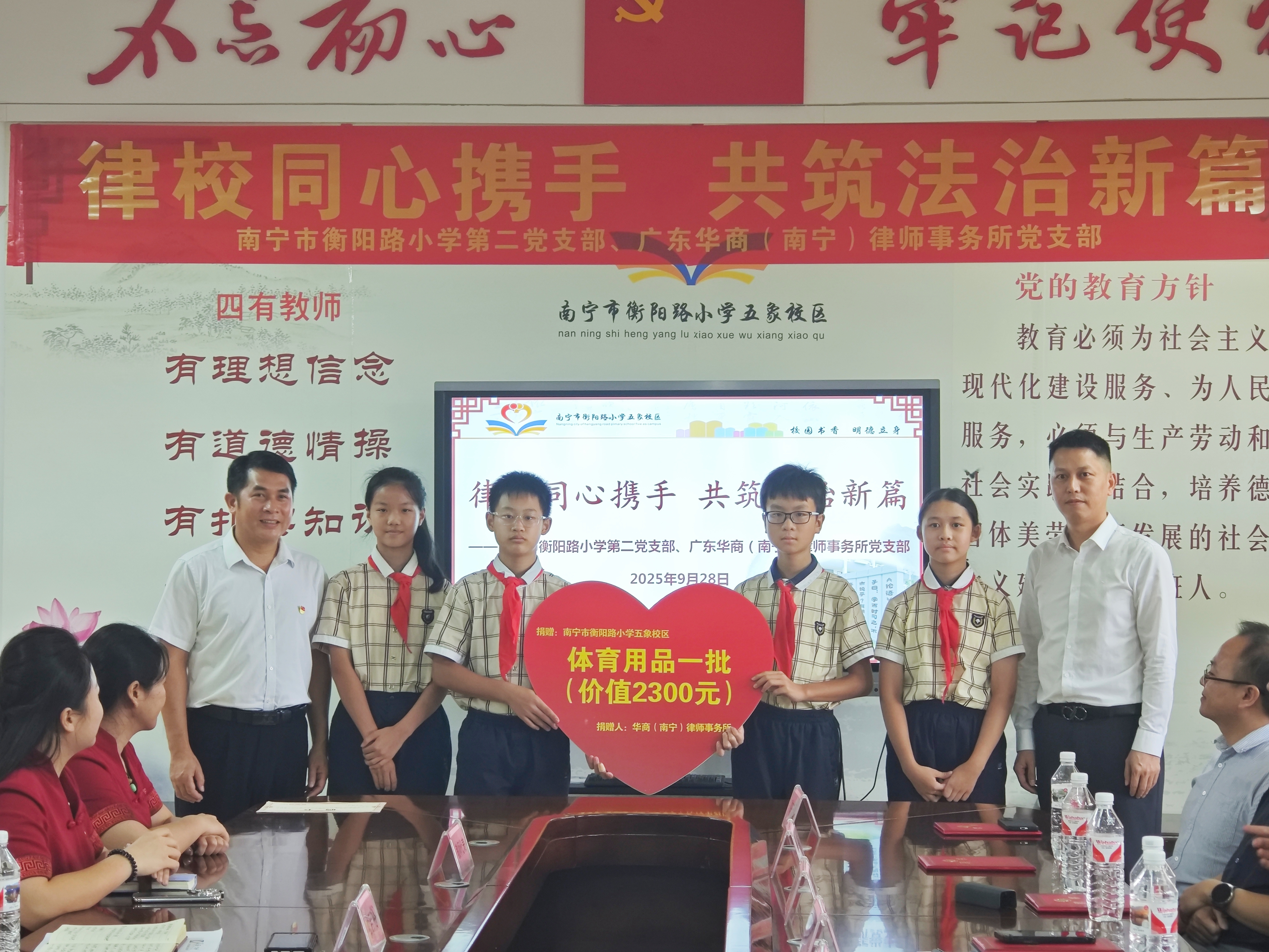 2025年9月12日全国人大常委会通过的《中华人民共和国法治宣传教育法》将于2025年11月1日起施行。为加强法治宣传教育,提升中小学生法律与规则意识,夯实全面依法治国社会基础,华商(南宁)律师事务所与南宁市衡阳路小学五象校区决定建立长期合作,联合开展公益法律服务活动。