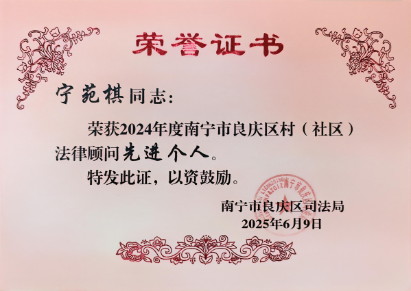 2024年度南宁市良庆区村(社区)法律顾问工作“突出贡献律所”称号;宁苑棋等四名律师被评为“先进个人”。