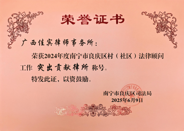 广西佳宾律师事务所荣获2024年度南宁市良庆区村(社区)法律顾问工作“突出贡献律所”称号、四名律师被评为“先进个人”