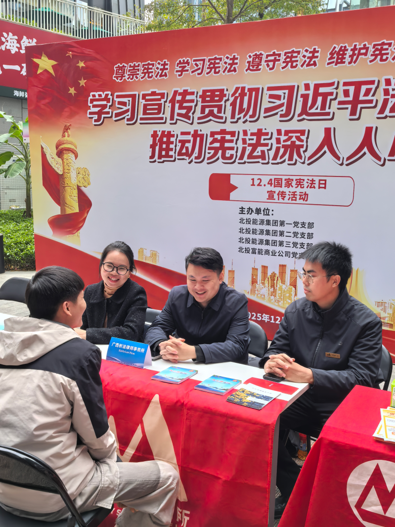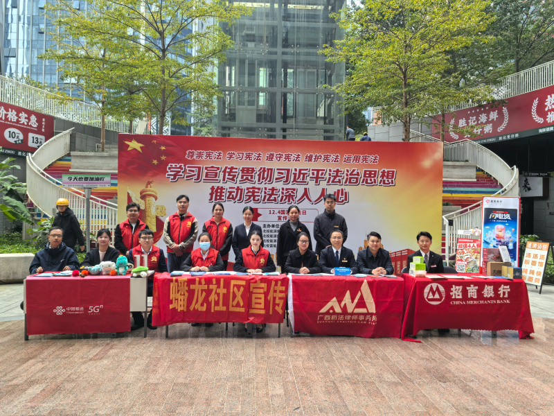 12月4日中午,广西析法律师事务所全体成员积极参与所在地蟠龙社区及北投富能商业组织的“12·4国家宪法日宣传活动”,通过设立法律咨询台、发放普法手册、现场答疑等形式,为群众提供免费法律服务。活动现场,律师们围绕婚姻家庭、劳动权益、民间借贷等民生热点问题,以通俗语言解读法律条文,让群众对法律有了更深的理解。此次公益行动是律所成员们以实际行动践行“做党和人民满意的好律师”的初心使命、助力基层法治建设的有效举措。