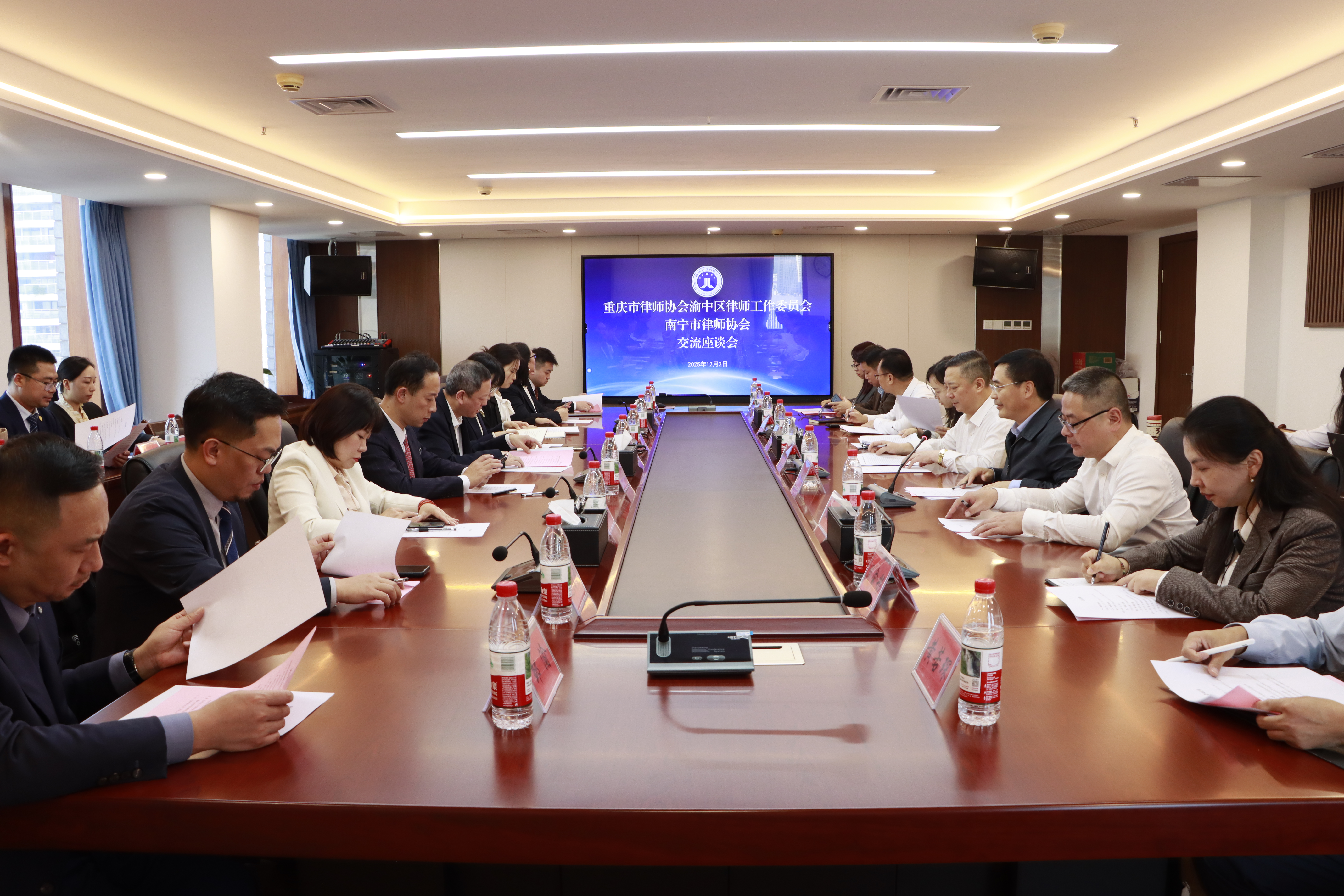 2025年12月2-3日,重庆市渝中区司法局副局长、律师行业党委书记符雷一行13人到我会交流座谈,南宁市司法局四级调研员、南宁市律师行业党委书记张加兵,南宁市律师协会会长、南宁市律师行业党委副书记周海船等人陪同座谈。重庆市律师协会渝中区律师工作委员会一行参观了我会办公场地并听取了我会发展历史、工作特色等介绍。