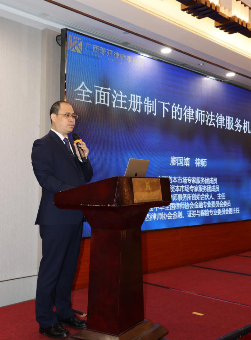 2023年4月1日,广西律师协会民事专业委员会,广西律师协会金融、证券与保险专业委员会,玉林市律师协会民事专业委员会,以及玉林市律师协会金融、证券与保险专业委员会,在玉林市联合举办“民法典时代的法律服务新格局业务交流会”,广西璟开律师事务所创始合伙人、主任廖国靖律师应邀作《全面注册制下的律师法律服务机遇》专题演讲。