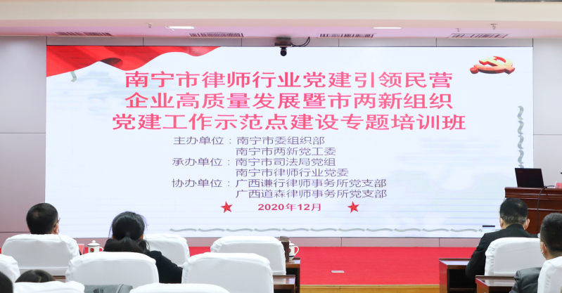 为贯彻落实南宁市委组织部、南宁市两新组织党工委《关于举办党建引领民营企业高质量发展暨两新组织党建工作示范点建设专题培训的通知》精神,进一步提高市律师行业党组织书记和党务工作者队伍素质能力,发挥本行业市两新组织党建工作示范点典型引领和示范带动作用,促进市律师行业党组织在全面落实强首府战略、推动南宁高质量发展中贡献力量,12月9日,南宁市律师行业党委举办党建引领民营企业高质量发展暨市律师行业两新组织党建工作示范点建设专题培训班。南宁市理论宣讲团成员、市司法局党组书记、局长黄有光同志亲临培训班并讲授了“党的十九届五中全会和强首府战略惠企政策”课。市律师行业党委委员、各律所党组织书记、党务工作者,市律师协会副会长、市律协秘书处和党办负责人及组织员参加培训。