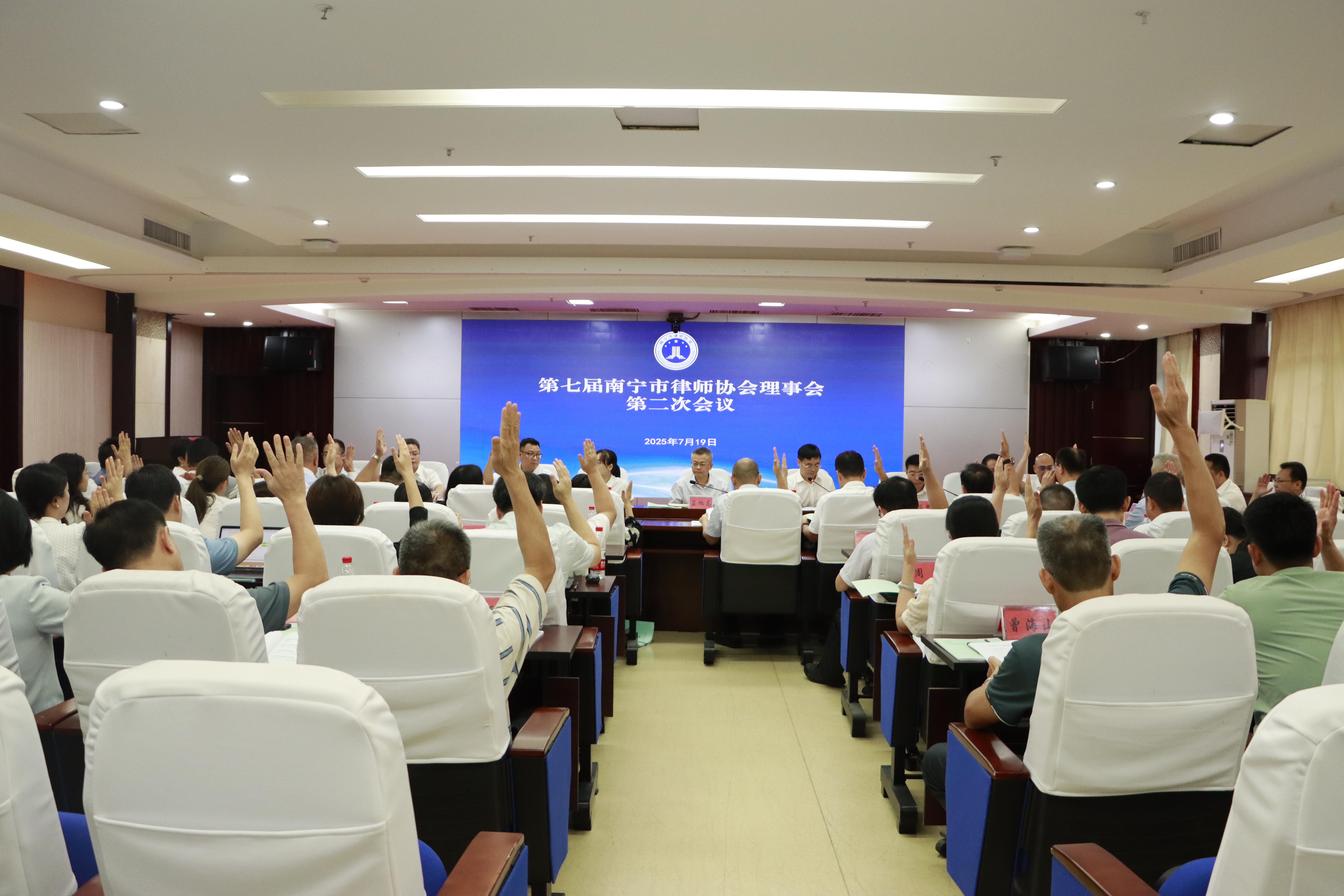 2025年7月19日,第七届南宁市律师协会理事会第二次会议在南宁市司法局会议室顺利召开。南宁市司法局副局长蓝旭高、南宁市司法局律师工作科科长、南宁市律师行业党委副书记王甜甜出席会议。第七届南宁市律师协会理事共57人参加会议。南宁市律师协会监事长石登崇、秘书长韦殿官、副监事长王小兵及监事列席会议。会议由南宁市律师行业党委副书记、南宁市律师协会会长周海船主持。