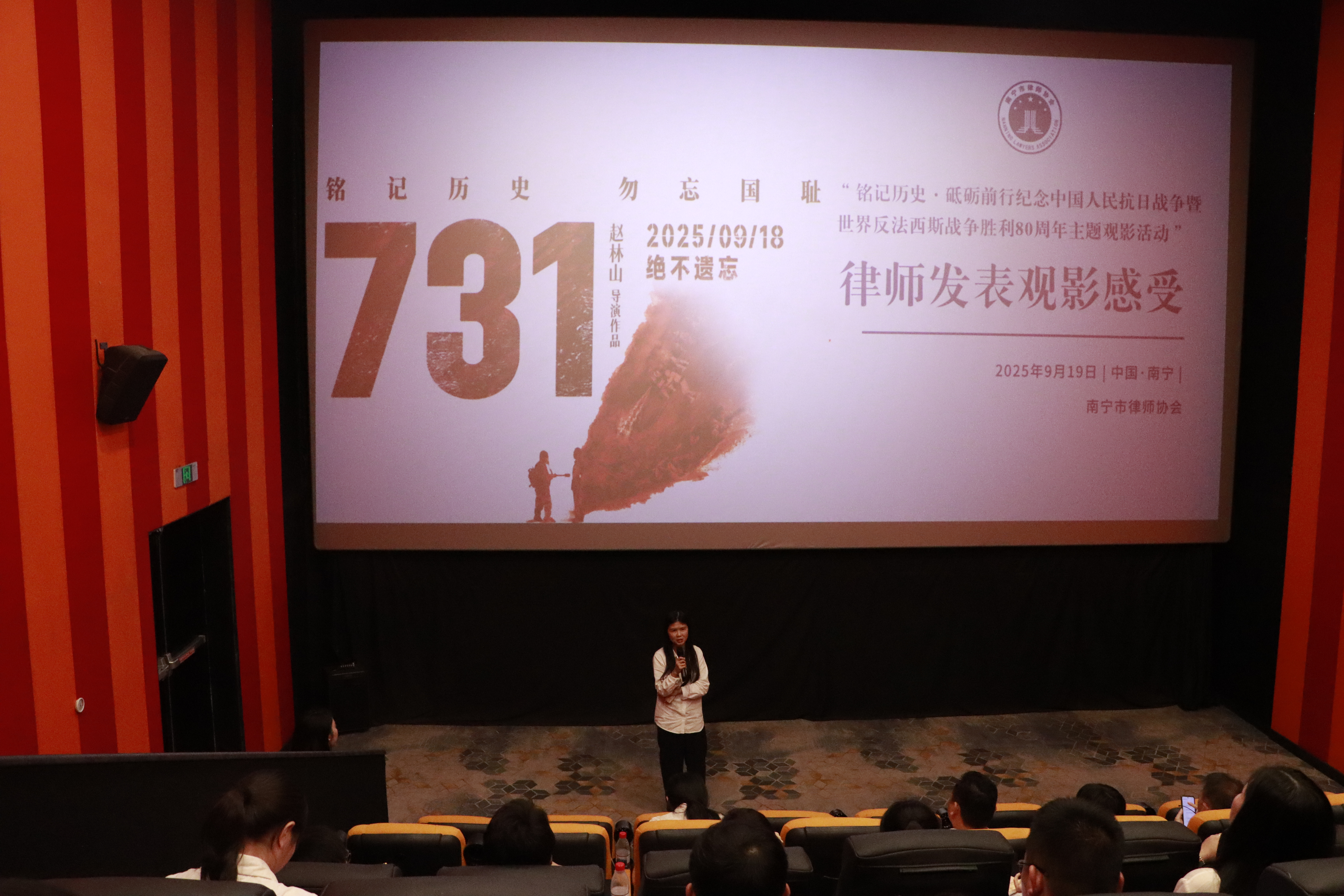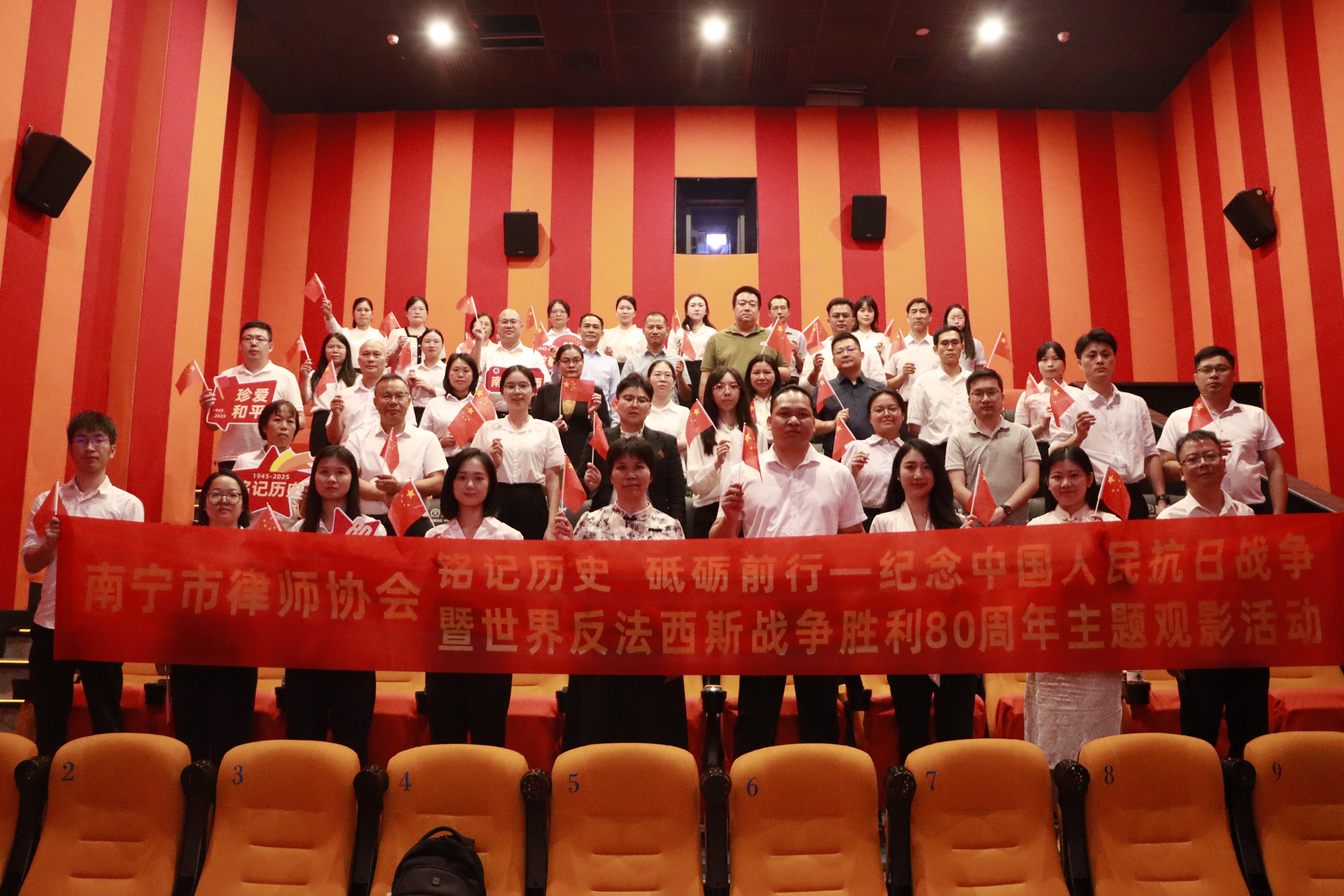 2025年9月19日,为纪念中国人民抗日战争暨世界反法西斯战争胜利80周年,缅怀先烈、弘扬伟大抗战及爱国主义精神、凝聚奋进力量,南宁市律师协会组织集中观看揭露日本军国主义反人类罪行的历史影片《731》,旨在以“铭记历史、砥砺前行”的精神指引,进一步筑牢法治信仰、厚植法律人的职业情怀。南宁市律师协会副会长滕黄铁、监事唐惠玲出席活动,南宁市律师协会宣传委员会委员及南宁市律师共50余人参加本次活动。活动由南宁市律师协会宣传委员会主任陈君主持。