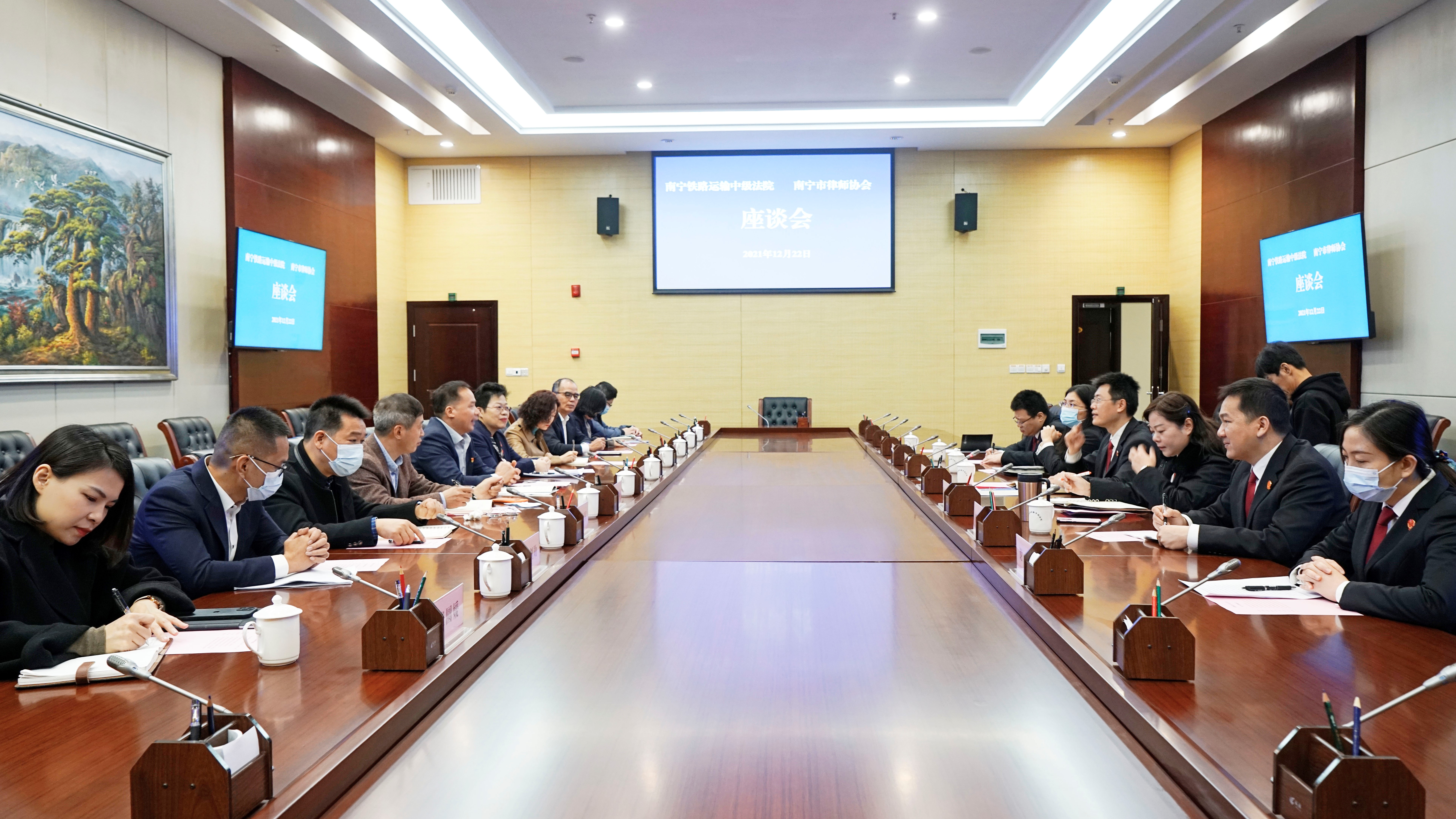 12月22日上午,南宁市律师协会陆仲坤副会长带队,南宁市律师协会行政专业委员会主任马艺珊等一行人到南宁铁路运输中级法院开展行政诉讼专题调研座谈。南宁铁路运输中级法院党组成员、副院长、政治部主任林国香,民二庭、立案庭、办公室等相关部门负责人参加座谈交流。