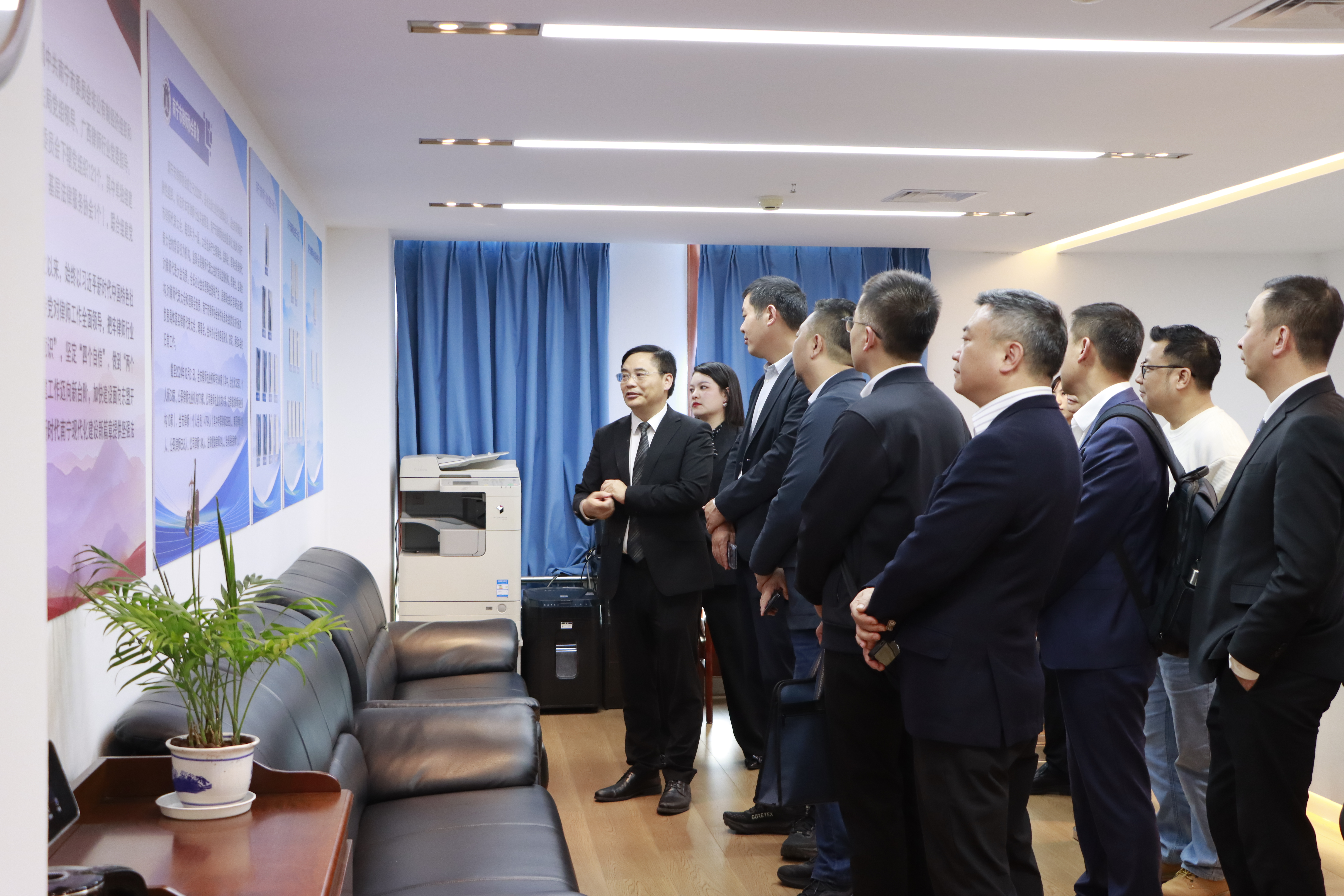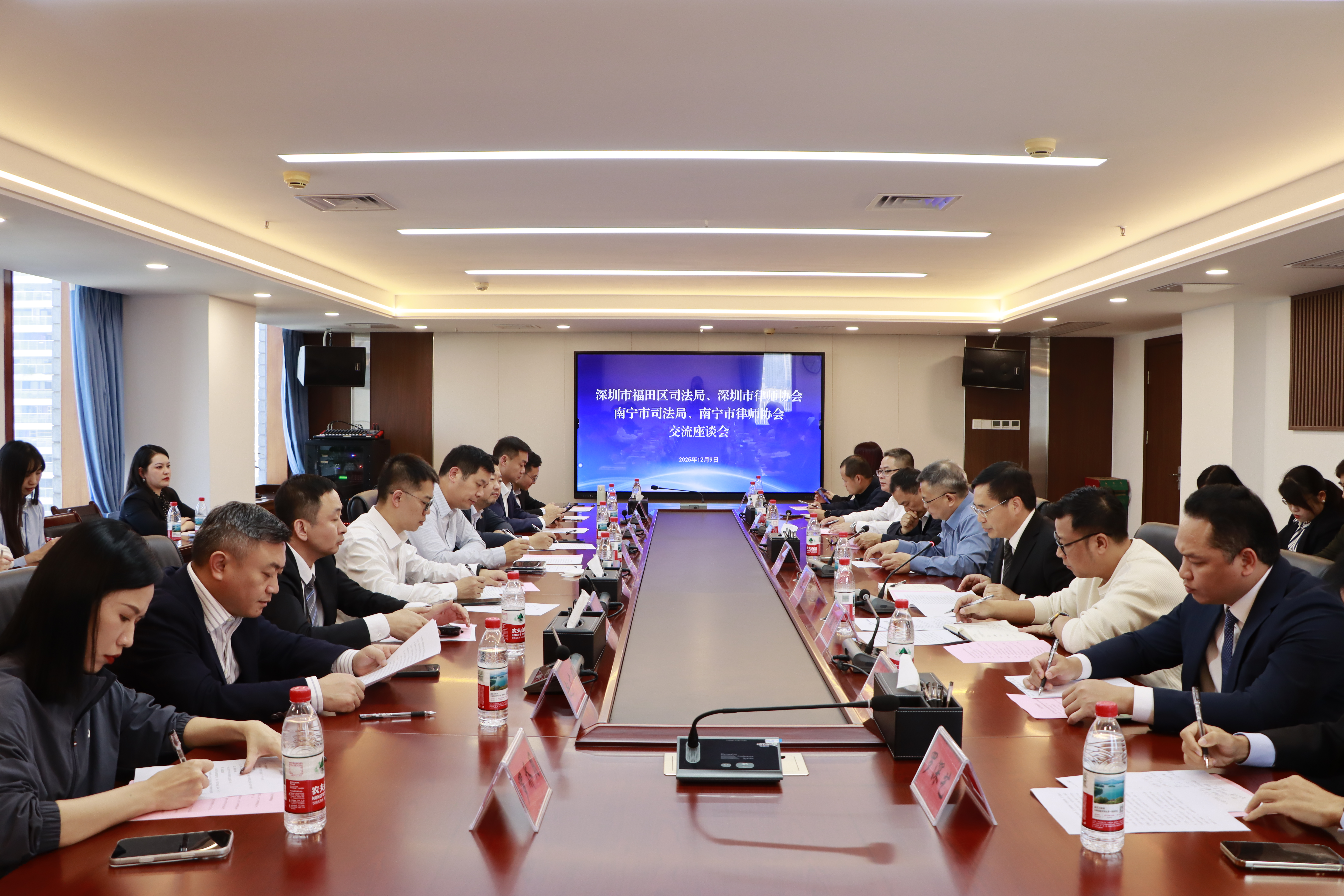 2025年12月9日,深圳市福田区司法局党组书记、局长王显军,深圳市律师协会副会长、福田区律工委主任黄远兵一行12人到我会交流座谈,南宁市司法局副局长蓝旭高,南宁市律师协会会长、南宁市律师行业党委副书记周海船等人陪同座谈。深圳一行参观我会办公场地,全面了解我会发展历程及工作特色等相关情况。